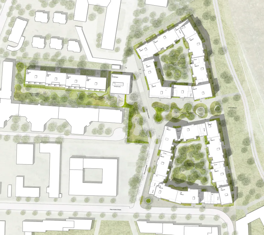 Die Freiflächen der Hausgemeinschaften werden mit malerischen Bäumen bepflanzt. Darunter befindet sich eine strauchfreie Krautschicht aus Wiesen, Bodendeckern und Wildstaudenfluren. Eine belebte Topographie ermöglicht ausreichende Substratschichten für ein nachhaltiges Baumwachstum. In den Senken befinden sich Wege und Kleinkindspielflächen, aber auch Rückhaltemulden für Starkregenereignisse. So entsteht ein wildes und naturnahes Bild, das von den anliegenden Hochparterremietergärten klar gerahmt wird. Durch die rhythmisierte Konturierung der Mietergärten entstehen fließende Raumabfolgen und Nischen für Sitzmöglichkeiten.