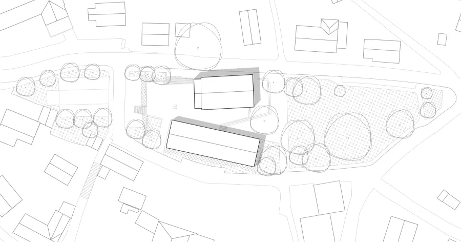 Großzügige Pflanzflächen aus Gräsern, Stauden und Kleinsträuchern umspielen die Gebäude und Belagsflächen und inszenieren die Topografie des Grundstücks. Ein in den Hang geschobener Baukörper im Süd-Westen des Grundstückes dient als Nebengebäude für die Gemeindeverwaltung. Über seine Dachfläche zieht sich die rahmende Vegetation von Nord nach Süd um den Dorfplatz, begleitet von Baumpflanzungen als Fortführung der Straßenbäume in der Marienstraße. Zwei Einzelbaumpflanzungen stellen die Verbindung zum wertvollen Baumbestand im Park her und beschatten die nördliche Terrassen- und Platzfläche.