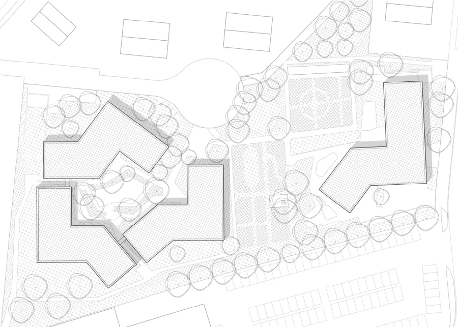 Ein zurückhaltender Freiraum umschließt die neue Bebauung und wird durch gezielte Aufweitungen und Baumsetzungen gegliedert. Im Wohnhof sowie im Übergang zwischen Wohnen und Kindertageseinrichtung entstehen Gemeinschaftszonen. Diese dienen als Aufenthaltsbereich und Treffpunkt für Jung und Alt.